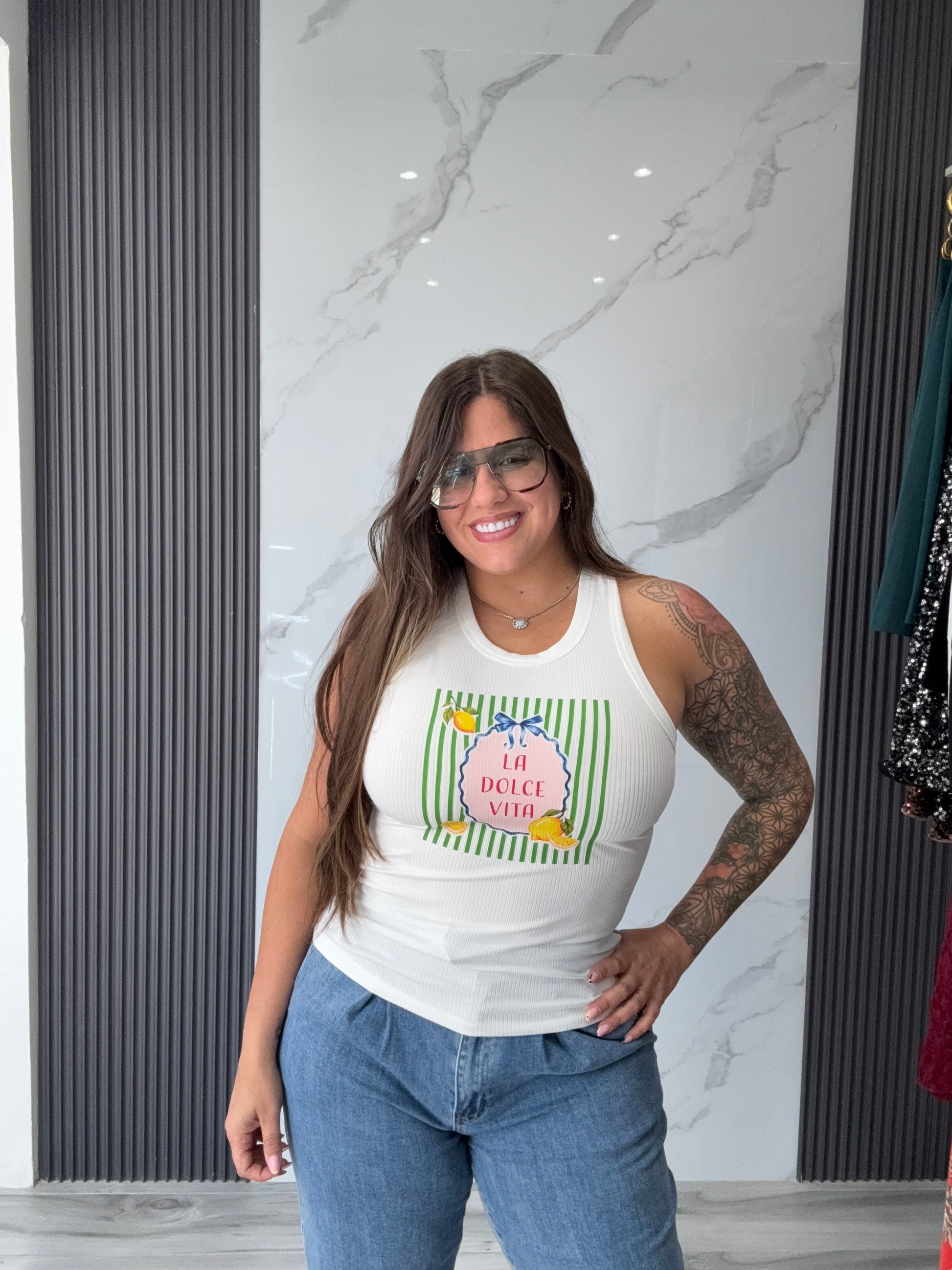 Tank top en tela rib con diseño gráfico “La Dolce Vita” que aporta un estilo fresco, elegante y veraniego.