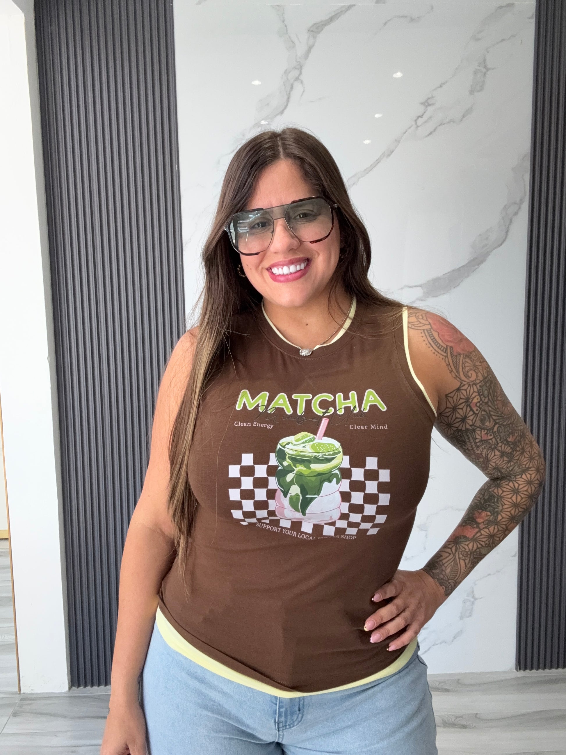 Top sin mangas con diseño gráfico de matcha que le da un estilo moderno y en tendencia.